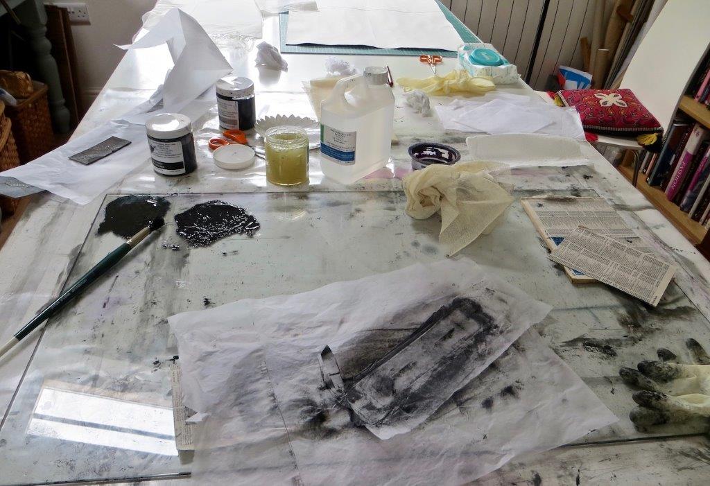 Time to clear up! the new inks are rubbed into the plate with a brush so next time I will mix them with the linseed in old yogurt pots rather than on the glass surface and see if that makes clearing up easier.