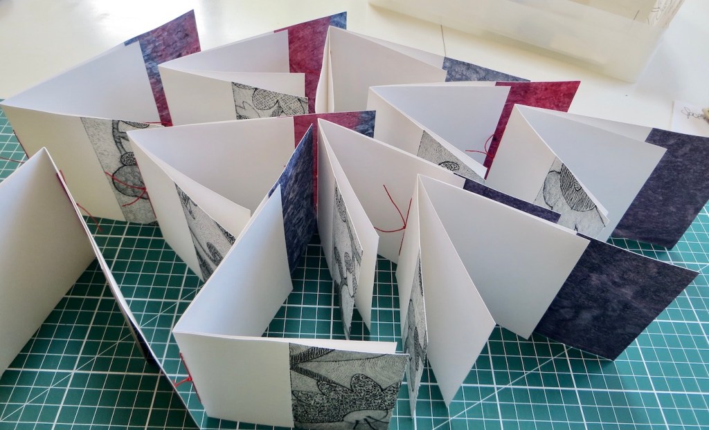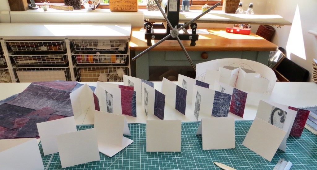 I dry them under weights as I need the paper to be truly flat, here I have used Somerset 250gsm. They are now wrapped in tissue until they are fully dry so that I can fold them into books.