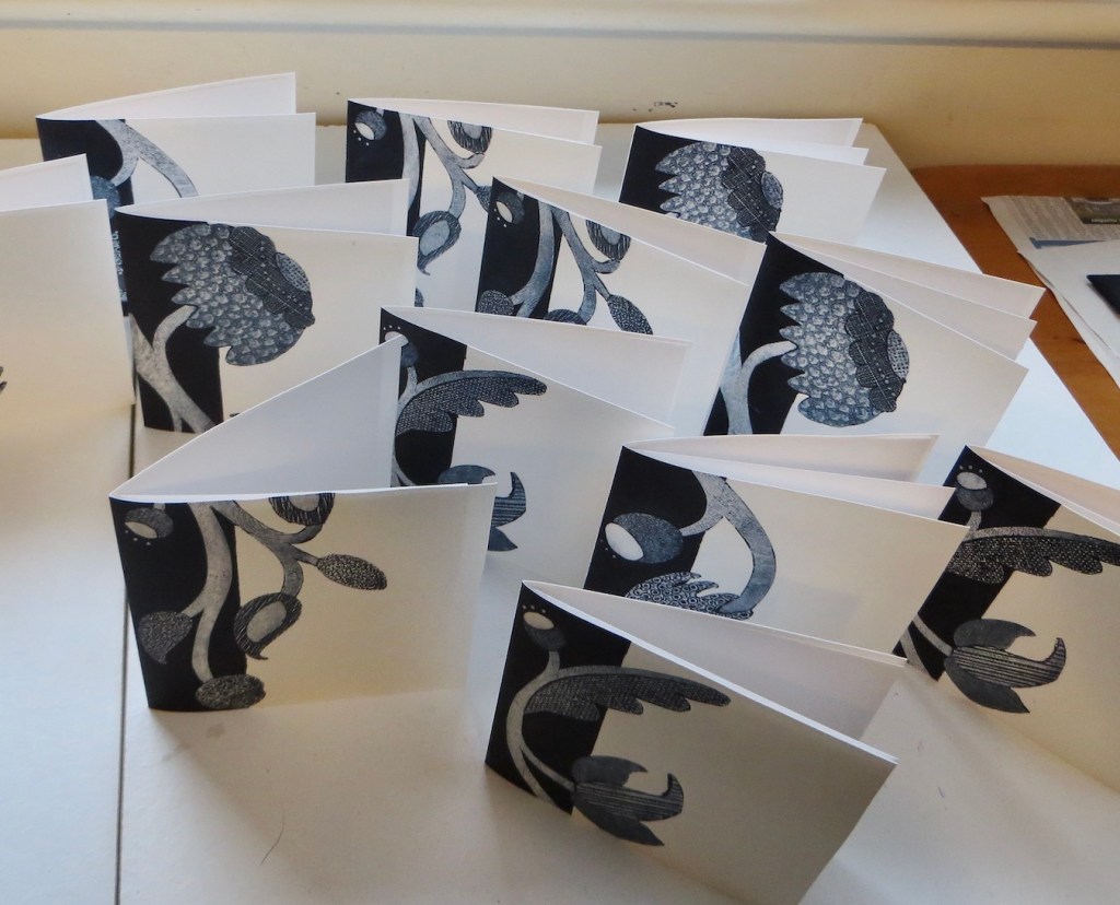 My red madder print, that is part of the Half a Yard series is now folded but I felt that as I liked the print and only two prints seemed insufficient usage of a plate I would print two in indigo for another two books. The indigo and madder prints were comfortable together, as they were frequently used on the same piece of cloth to fashion a design.