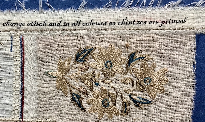 The cover incorporates a piece of Mogul silk embroidery to cotton dating from c1800, there are signs of wear on it, but they are part of its journey.