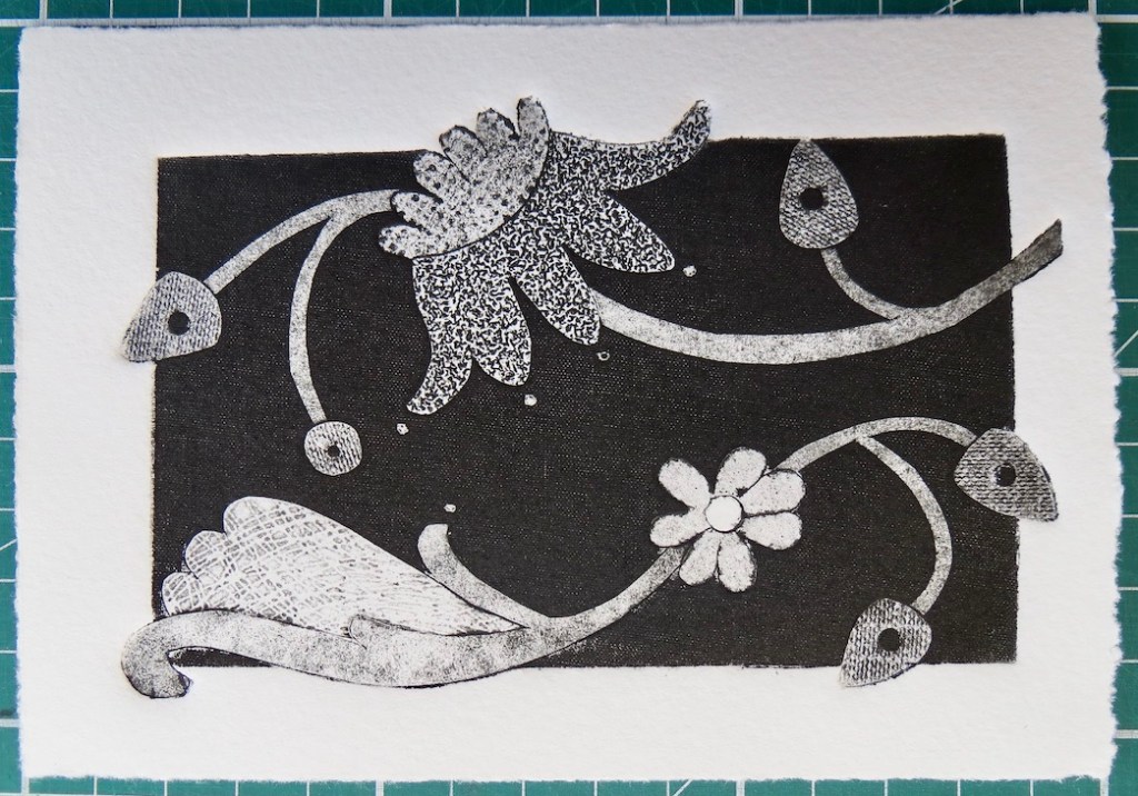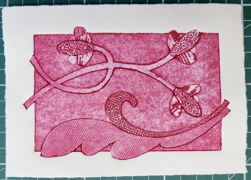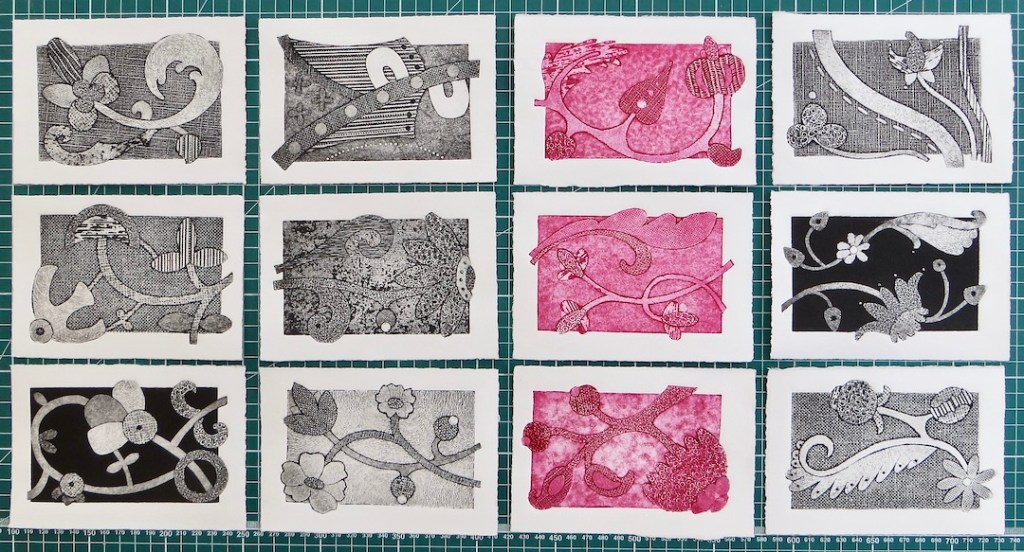 I decided to work these in red ink as red was the base colour for most of C18th printed fabrics. Different mordants were use and when mixed with the madder root (red) generated a range of colours from pale pink to black.