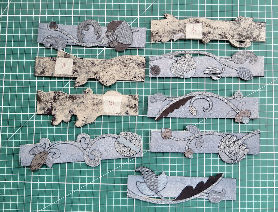 So this image shows the beginning of a redesign of the plates used in the book shown here, from a blog from last November. I cut each plate up a little more so that the exposed designs were on both sides of the plate. The numbers on the reverse depict what size of print I can obtain from each plate. That is as far as I have managed to get. There may well be a delay as my husband is sanding and then painting the studio windows and this isn’t conducive to printing!