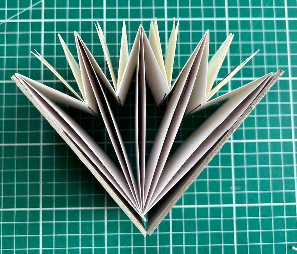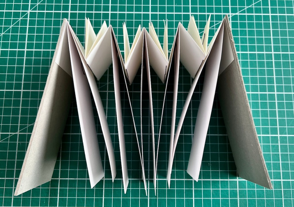 This concertina with pamphlet stitched pages to both sides was in the first try too floppy, so I cut the long pages down from 15cm to 10cm and I was then content with the shapes that it made and the firmness of the construction. Will it go any further? Who knows!