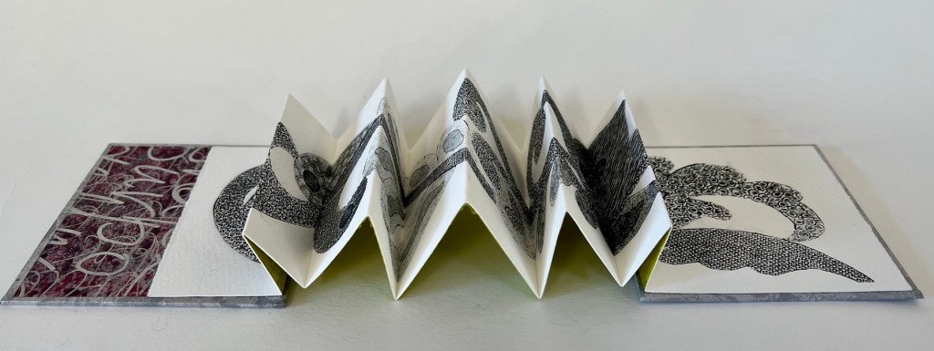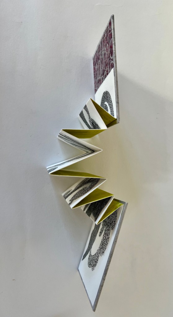 Fiona and I have now opened the first books in our collaboration, there have been plenty of smiles and appreciation of each others work and intense interest in our individual interpretations of the title. The diversity of the two books is a joy and demonstrates the wide spectrum within the definition of the term ‘Artists’ Books’