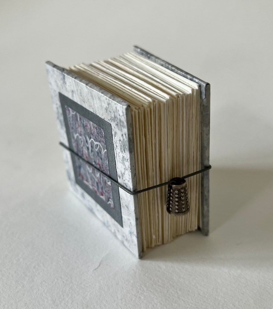 This book called ’26 Fragments’ sprung from a pile of folded, small Indian paper pieces, that were in my drawer. I embossed an oblong recess in each, to receive a printed fragment and on the facing side I placed a tissue paper fragment with text. They were folded to face each other, as that is the way that the book falls open. There are 26 folded pieces bound together with Coptic stitch. The book is 6.5cm high, 6cm wide and 4.5cm deep.