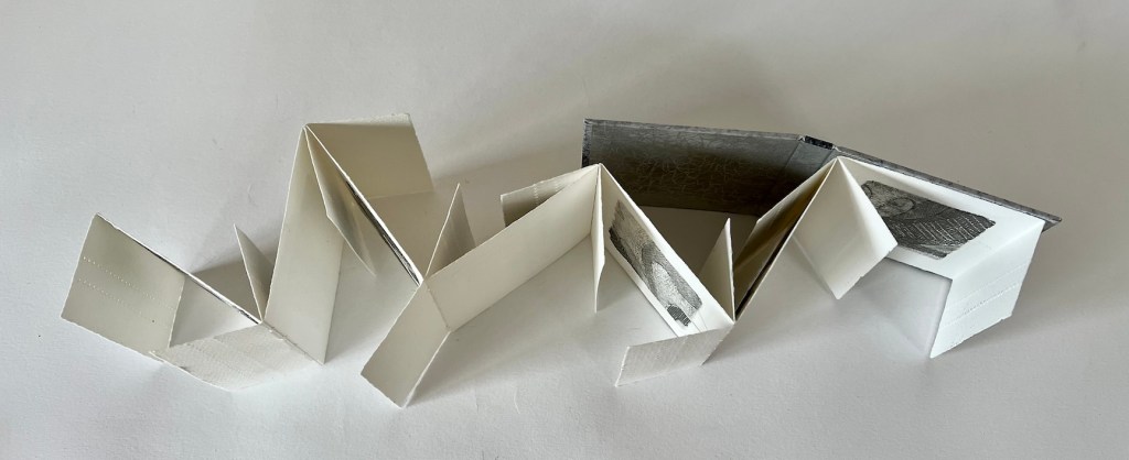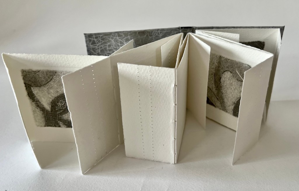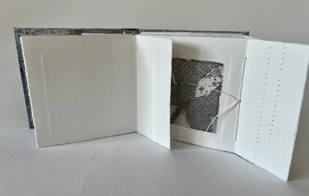 And so on to making a differently constructed book, called Fragmented Folds. The book is constructed from 7 pieces of Indian Cotton rag paper stitched together. A recess has been made in the centre fold with and a collagraph print fragment placed within and embossed linen to the reverse. There are stitched holes to either side. It measures 8.5 x 8.5cm.