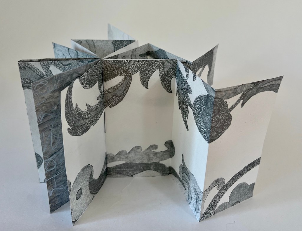 This book is a new variation and involved printing 56 pages for the two books. The printed page edges are derived from the print of lace, fully worked in the book “Shape Defines Purpose”.